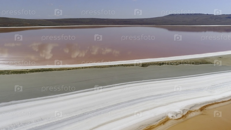 Вид на красивый пейзаж с розовым озером. Снимайте. Инопланетное чудо природы - это озеро с розоватой водой. Красивый пейзаж с розовым озером, белым песком и горами на горизонте