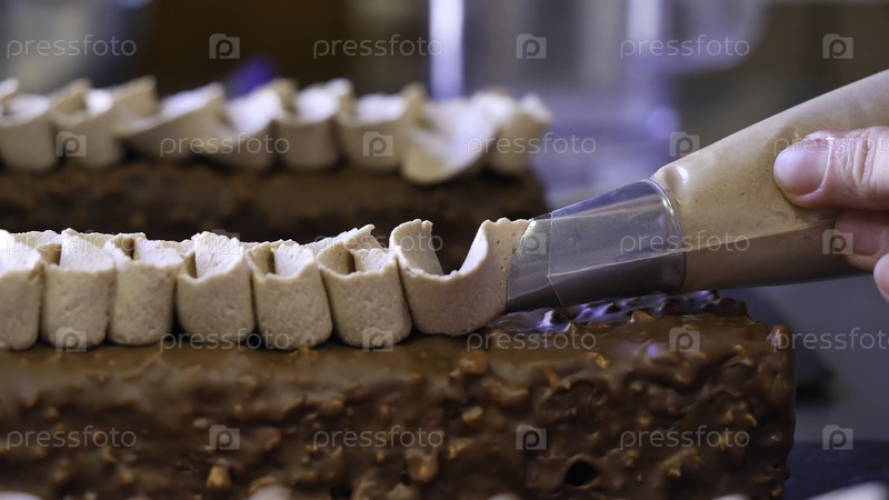 Выпечь пирог, выжать сливочный крем на торт вкусный сладкий сливок сжатый на торте