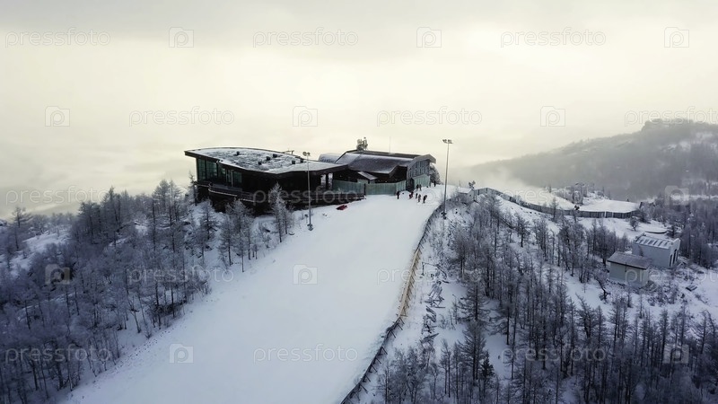 Вид на прекрасный пейзаж со лыжного курорта с трассы зимой. резервные кадры. вершина горнолыжной полосы с кафе посреди зимних облаков закат солнца среди гор