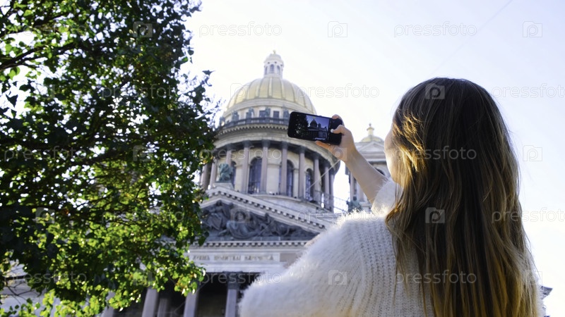 Красивая молодая женщина фотографирует собор по телефону Концепция: привлекательная женщина делает фотографии купольного собора, который является популярной достопримечательностью в старом городе