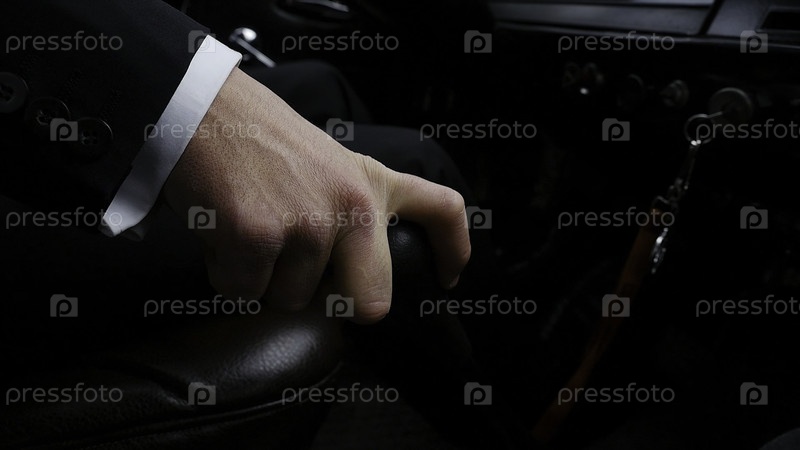 Бизнесмен идет на работу, вручную меняя передачи. Бизнесмен переключает трансмиссию на редкий автомобиль. Бизнесмен за рулем автомобиля вручную переключает передачи. ретро-стиль