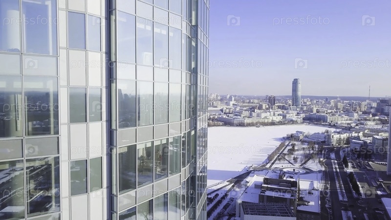 Стекло небоскребов с облаками, Бизнес-концепция архитектуры.Отражение города в окнах башни