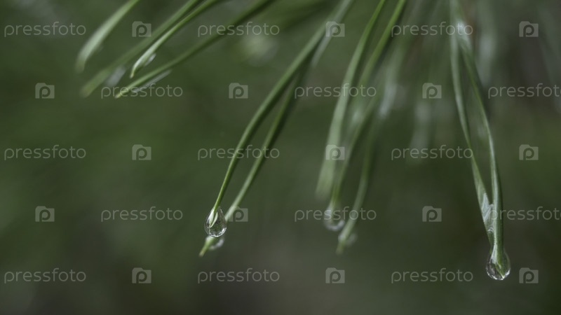 Закройте капли дождя на зеленых иголках сосны свежим зелёным копировальным пространством Абстрактный фон хвойных вечнозеленых ветвей сосны с росовыми каплями Капли дождя на сосновых иглах с солнечным светом