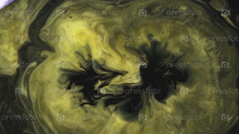 Многоцветные краски наливают молоко в узоры. Близкий план ярких цветных красок, капельничающих на поверхность белой жидкости. Красивые абстрактные полосы гладких цветов желтого и черного