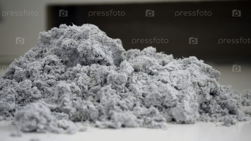Закрывая горсть пыли. целая куча пыли из пылесоса была вытащена перчатками. переработанный серый материал на столе