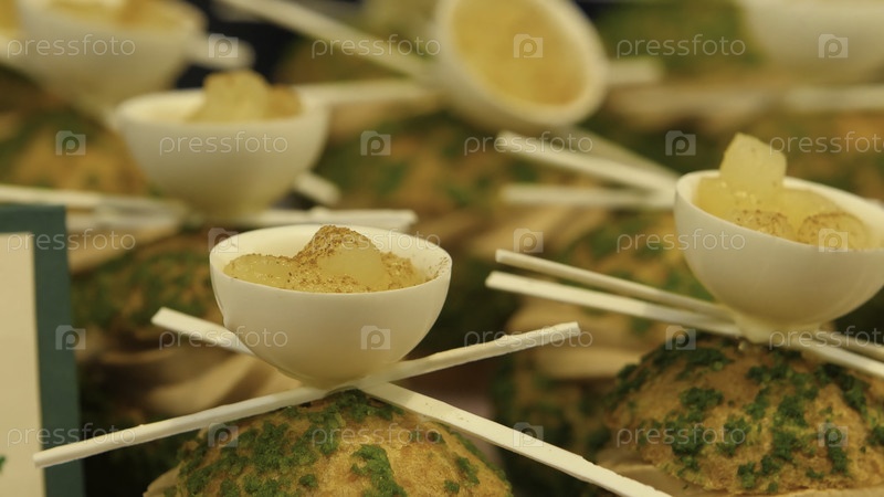 Картофельные пирожные шарики на кухонном столе с марципаном.Многие торты делаются вручную творческим кондитерским шефом.Вкусные красивые торты