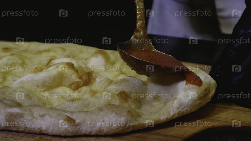 шеф-повар поливает пиццу томатным соусом. рама. повар наливает томатный соус на итальянскую пиццу. традиционная итальянская пицца. концепция приготовления