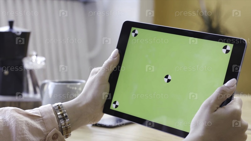 Молодая женщина сидит за столом и смотрит на планшетный компьютер с зеленым экраном