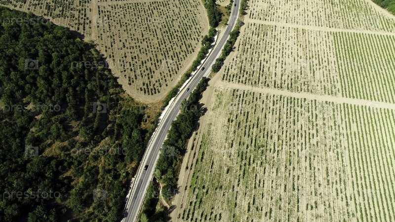 Вид на шоссе вдоль сельскохозяйственных полей.Стреляйте.Зерновой урожай, выращенный под палящим солнцем