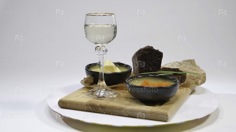 Свежая красная икра с базиликом и маслом на хлебе в студии. Она разводится из красной икры со стаканами вина на заднем плане. Холодная русская водка с льдом и небольшие бутерброды-перекусы с маслом и рыжей лососевой икрой на старом деревянном столе в руст