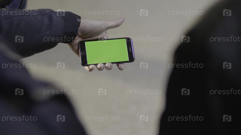 Мужчина показывает другу новое приложение на своем мобильном телефоне - телефон с зеленым экраном