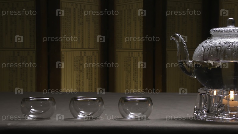 Красивая теплая картина прозрачного чайника с вкусным зеленым черным чаем на столе со свечами. Стеклянный чайник с цветущим цветочным чаем на деревянном столе. Стоять с маленькой свечкой. Китайский чай