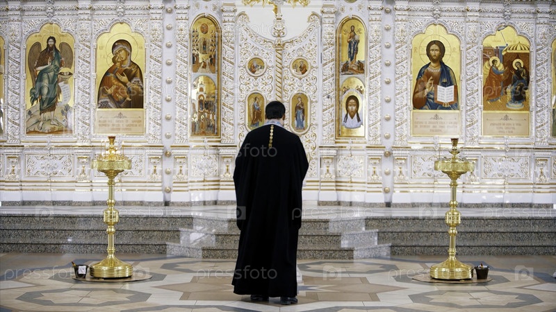 Иконостас внутри Православной церкви. видео. задний вид священника, стоящего перед иконами с лицами святых, концепция религии, внутренние детали внутри церкви