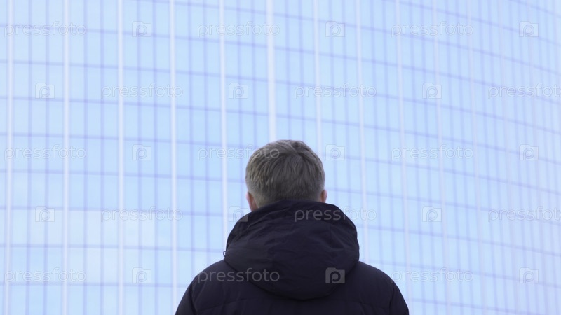 Сзади мужчина, смотрящий на стеклянное здание.СМИ. Мужчина стоит и смотрит на стеклянный фасад современного офисного здания