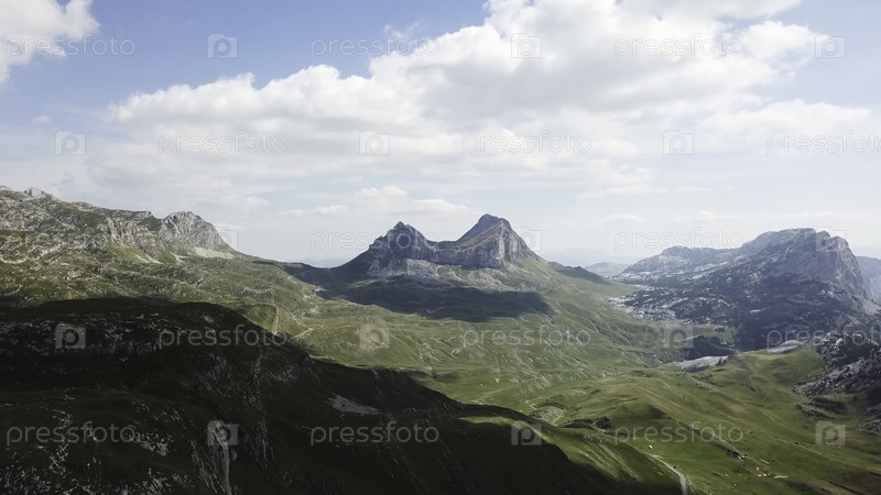 Вид сверху на горную панораму. Сток. Солнечный день с облаками в горах. Впечатляющий пейзаж гор и скал. Горная долина со скалистыми скалами
