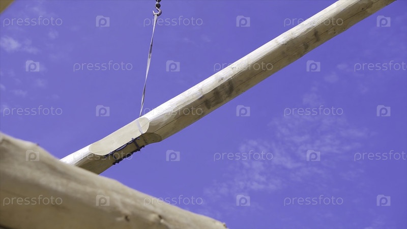 Кран поднимает балки против голубого неба.Клип.Кран на строительной площадке поднимает тяжелое обработанное дерево на стройплощадку