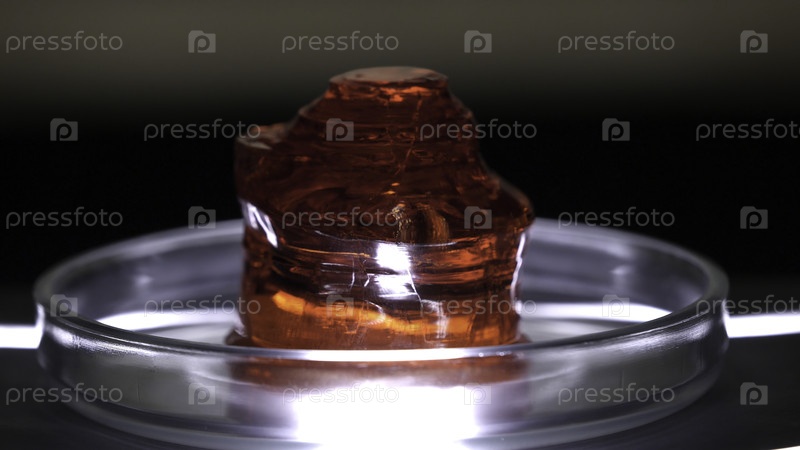 Образец красного минерала на чистом стеклянном стакане в лаборатории. драгоценный камень или необработанный минерал