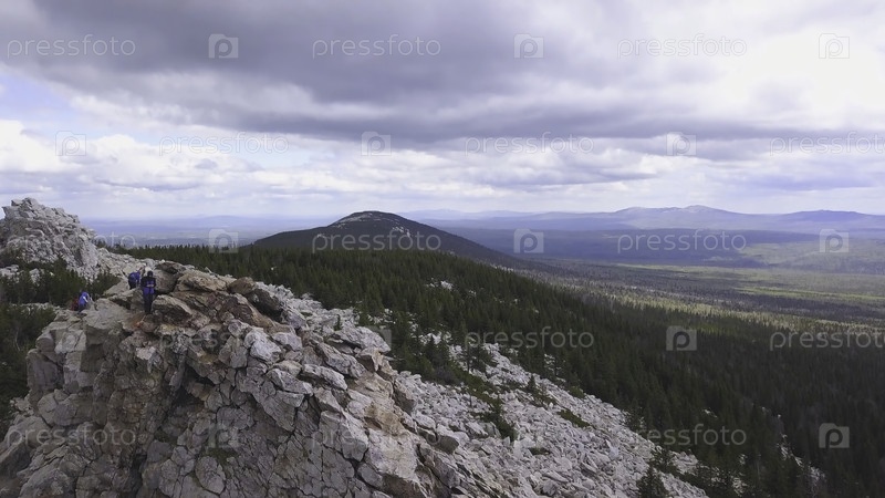 Горизонт холмистой местности с облачным небом. Вид на туристов, поднимающихся по скалистым утесам