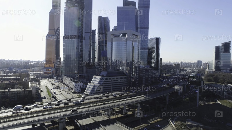 Вид на бизнес-центр в мегаполисе с трафиком. Сцена. Красивый дневной городской пейзаж со стеклянными небоскребами деловых центров и людьми, спешащими к работе в автомобилях