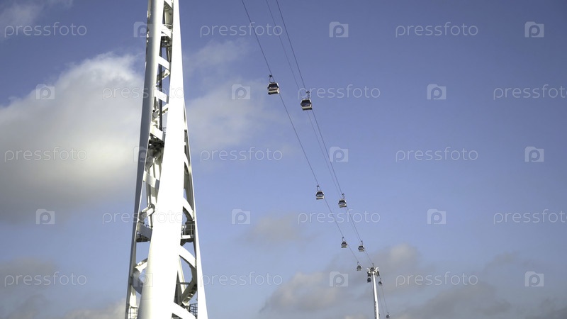 Современная канатная дорога с кабинами на голубом фоне неба. продолжайте. красивая канатная дорога с современными кабинами и прекрасный дизайн против неба