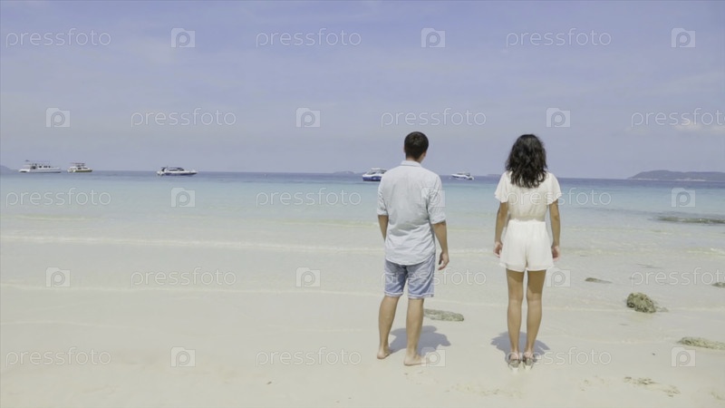 Молодая пара стоит на мокром песке у моря и смотрит в голубое небо. Красивая молодая женщина держит своего красивого партнера, пока они вместе смотрят закат солнца на романтическом пляже. Летние каникулы - пара на тропическом пляжном праздничном стенде в