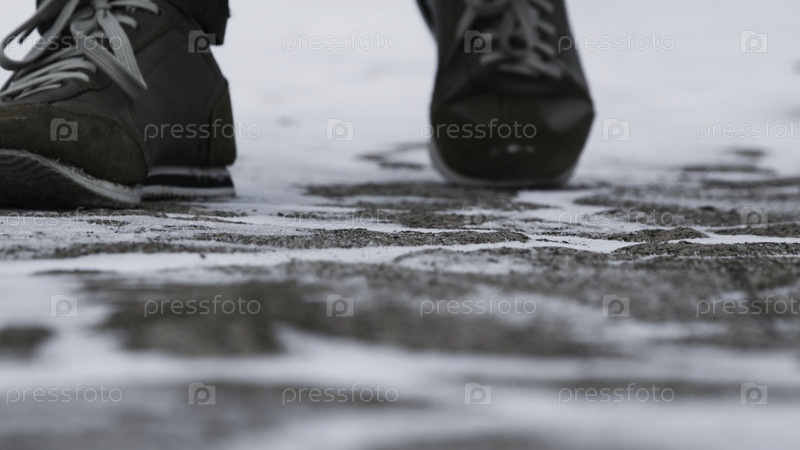 Соединение мужских ног в зимних ботинках, идущих по снегу. Видеозапись, Вид ходьбы по снегу со снеговыми туфлями и шипами на обуви зимой. Мужские ноги в сапогах закрывают заснеженную тропу