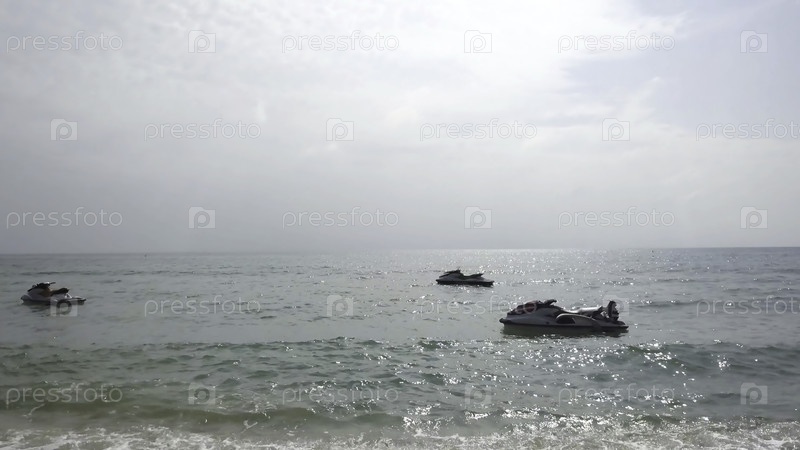 Плавание или джет-ски на воде в море и на фоне захода солнца. Детский лыжник Привязанный к морю на удивительном голубом фоне, пляж летнего стиля. Красивый пейзаж с джет-ки или водным велосипедом в море с волнами и солнцем