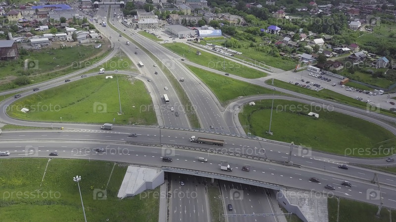 Вид с воздуха на пересечение автомагистрали.Автомобиль и мостик с автомобилями и грузовиками, перекресток, двухуровневый дорожный разъезд в большом городе.Вид сверху