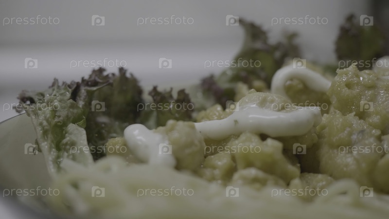 Альфредо феттусин с белым цыпленочным соусом из кабачков. Паста фетуцин альфредо с курицей, пармезаном и петрушкой на белом фоне закрывается. Итальянская кухня 4K