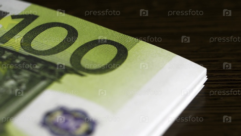 Стоевровые банкноты в ближайшем плане. Евробанкноты считаются на черном фоне. Евробанкноты падают на деревянный стол. Понятие денег