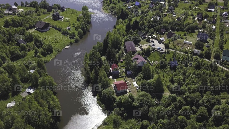 Вид из воздуха на город с множеством зеленых деревьев, расположенных вдоль реки в солнечный летний день. Клип. Экологически чистый район с маленькими красивыми домами и узкой рекой
