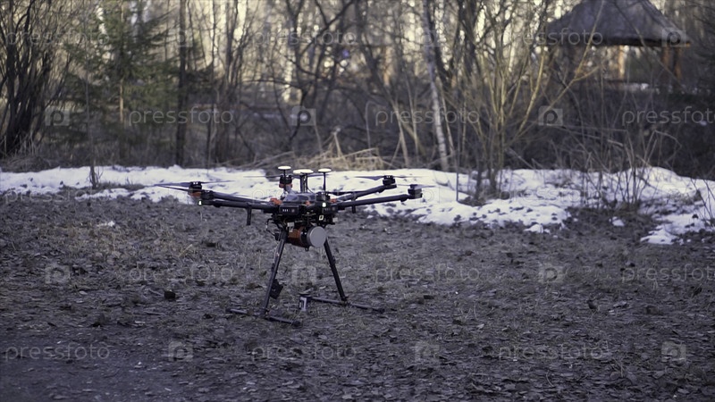 Покрыть черный дрон, стоящий на земле перед полетом, концепция аэрофотосъемки. Клип. квадрокоптер начинает вращать лопатки и взлетает