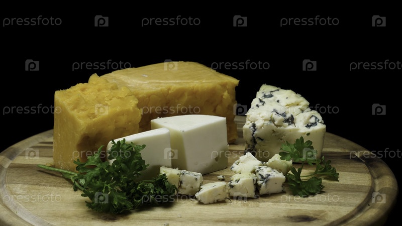 Близко к французским вкусным старым сырам, нарезанным и подаваемым на деревянной доске, изолированной на черном фоне