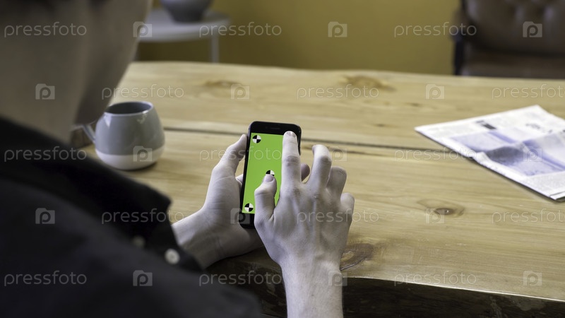 Один парень держит электронный гаджет с зеленым экраном chromakey, прокручивает и нажимает его против деревянного стола. резервные записи. Человек сидит и использует мобильный телефон в комнате