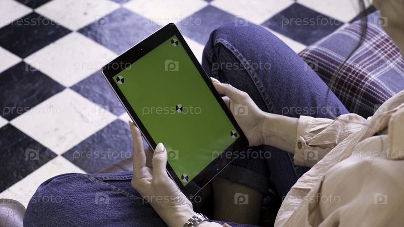 Женщина руками использует планшет с зеленым экраном, сидя на диване дома, вид со спины. резервные кадры. Молодая брюнетка смотрит на планшет с хромированным ключом
