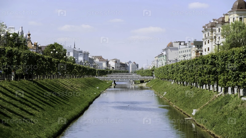 Красивый вид на город с зелеными деревьями и белыми домами вдоль реки.Романтические дома вдоль речного канала в старом городе Центральной Европы