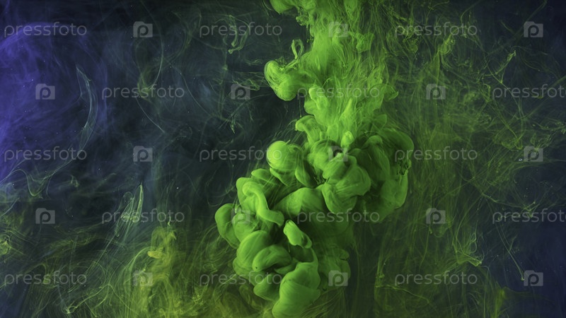 Прекрасная смесь акриловой чернил в темно-синей искрящейся воде.Закрывайте поток зеленого чернила, образуя удивительное облако при смешивании с водой