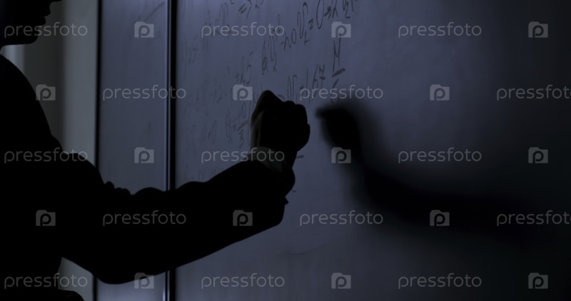 Ученый пишет формулы на доске.Рука мелом писала физические формулы на черной доске