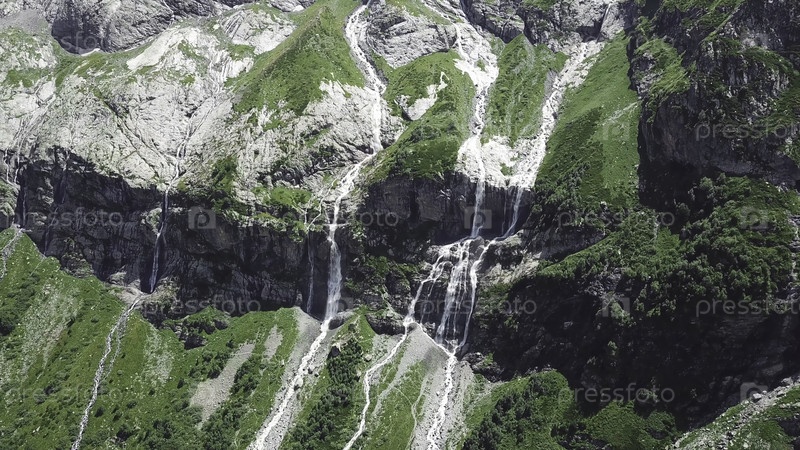 Водопад сливается с высоких гор в солнечный день. Вид на гору, из которой течет река