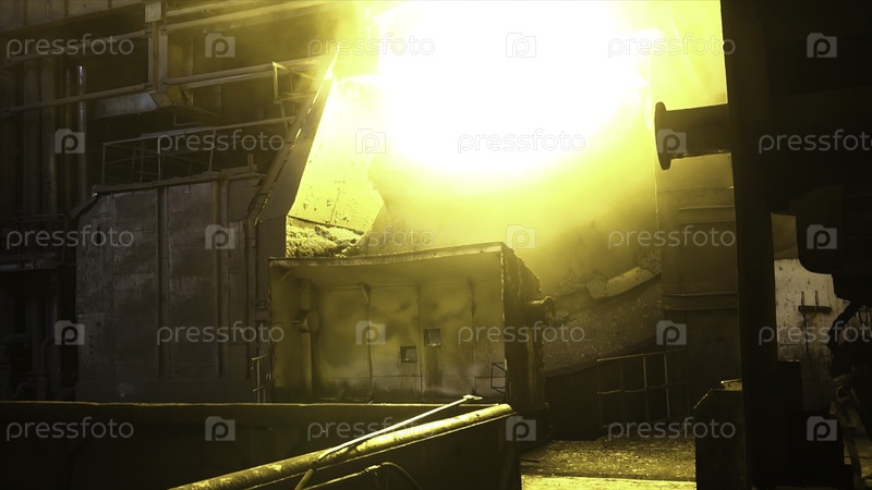 Интерьер сталелитейного завода с огромным ведром горящего металлического сплава. Кадр. Вид на печь под открытым небом с ярким светом пламени при таянии на металлургическом предприятии. Концепция опасных работ в тяжелой промышленности