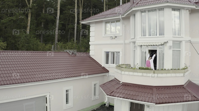 Видео. Вид женщины, наслаждающейся утренним утром на балконе большого загородного домика посреди леса