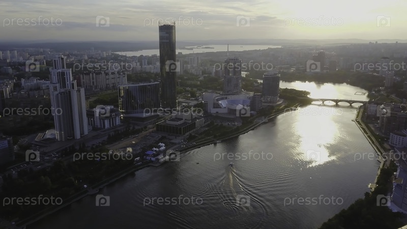 Вид на город с высоты птичьего полета, современные здания, река города. Прекрасный вид на город из воздуха. Большой современный центр города, видом сверху