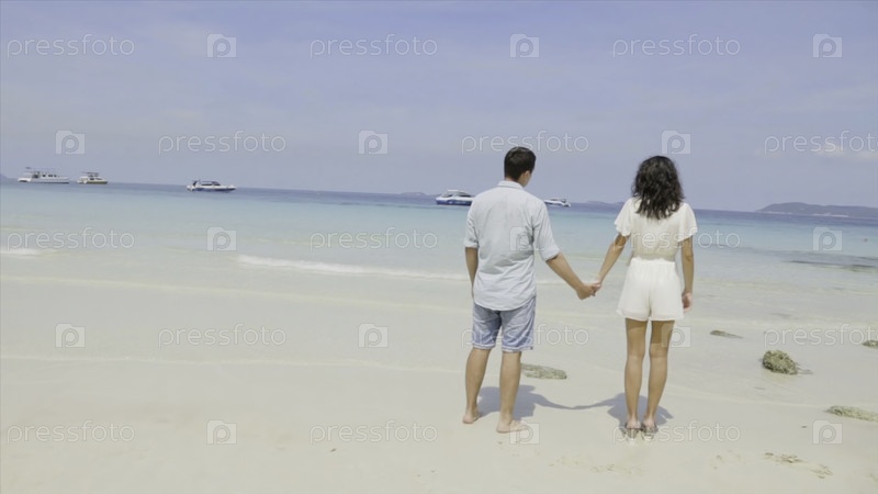Молодая пара стоит на мокром песке у моря и смотрит в голубое небо. Красивая молодая женщина держит своего красивого партнера, пока они вместе смотрят закат солнца на романтическом пляже. Летние каникулы - пара на тропическом пляжном праздничном стенде в