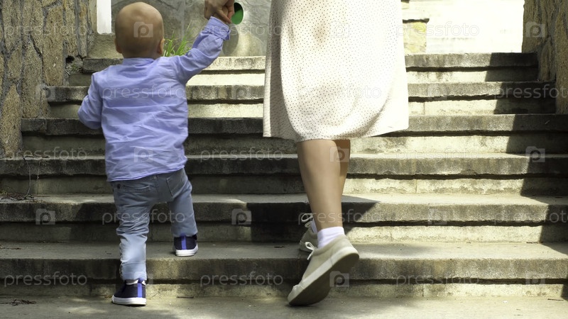 Женщина помогает своему маленькому сыну подняться по лестнице, держа его за руку