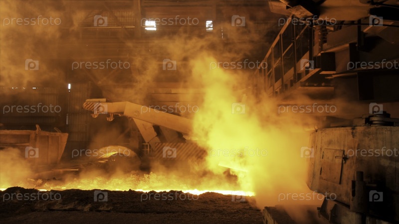 Горячая сталь наливается в канаву на металлургическом заводе, концепция тяжелой промышленности.Производство расплавленной стали в электрических печах