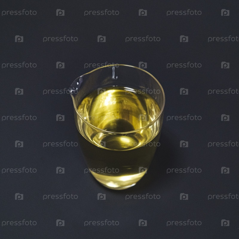 Прозрачная кружка, наполненная красивой золотой жидкостью, помещена против темного фона поверхности
