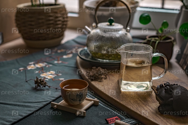 Эта безмятежная чайная комната включает в себя стеклянный чайник, нежную чашку и успокаивающий декор, идеально подходящий для отдыха