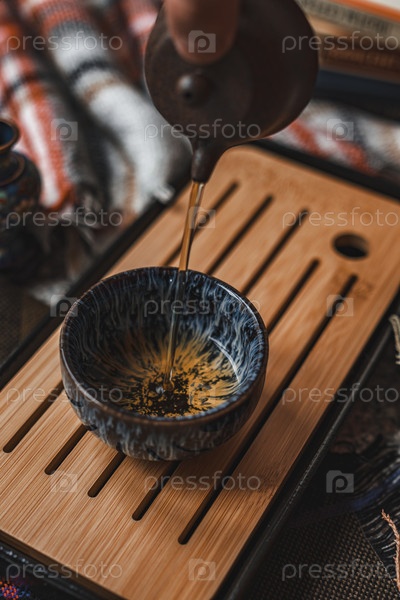 Эстетический snap захватывает масло, изящно залитое в красиво выполненную керамическую миску на бамбуковом подносе