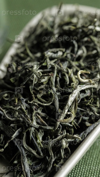 Потрясающий крупный план свежесобранных высококачественных листьев зеленого чая, представленных на стильном блюде