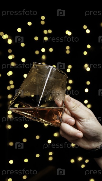 Рука, держащая стакан богатого спиртного в окружении золотистого боке, создает теплую, приглашающую атмосферу